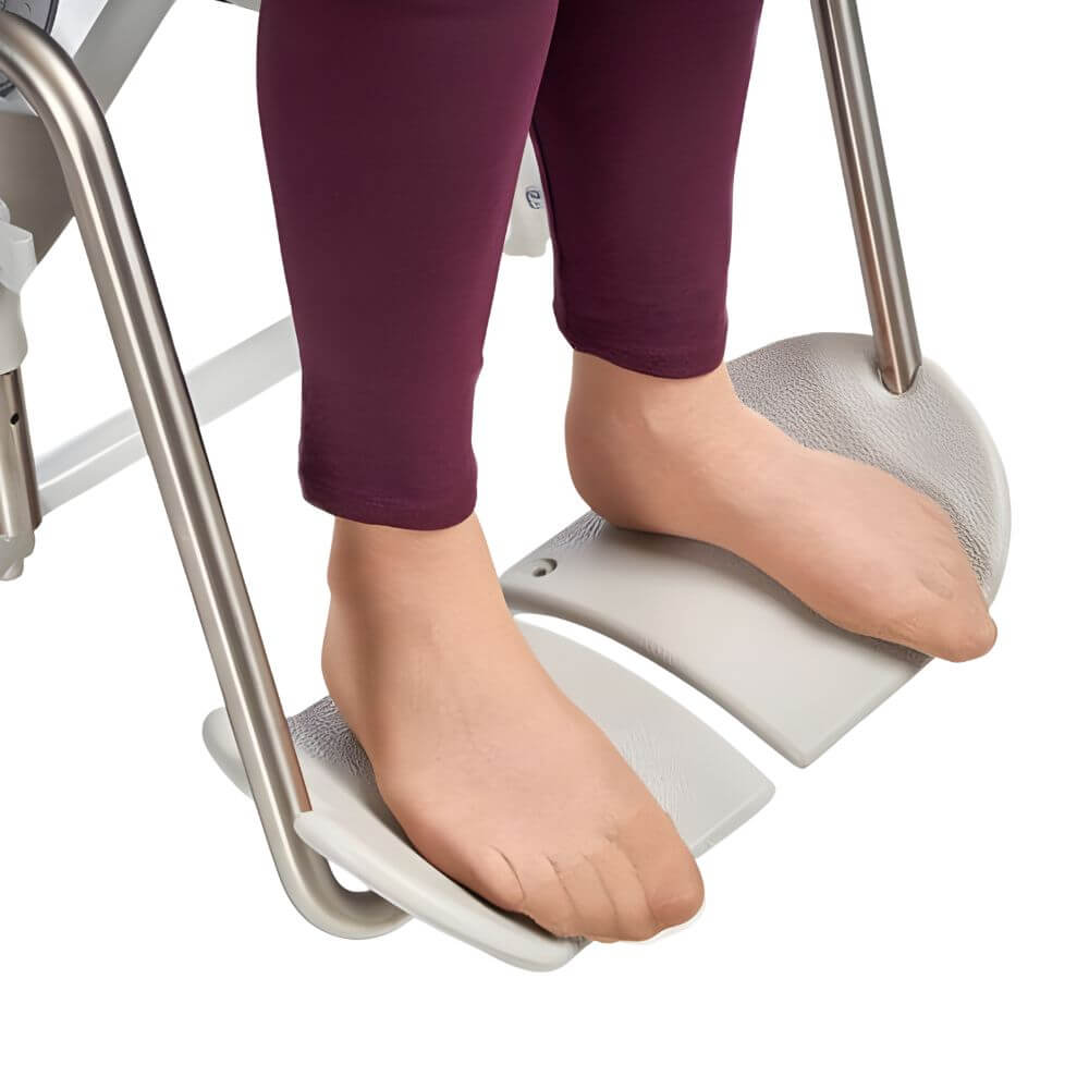 This comfortable and multi-adjustable commode features a tool-free seat height adjustment (45cm-60cm) that moves the centre of gravity forward to further improve safety. The height-adjustable arm & footrests swing easily out of the way to facilitate smoother transfers, ensuring a perfect fit for your needs. The gently arched footrests provide stable and comfortable support for the feet, enhancing the feeling of security.