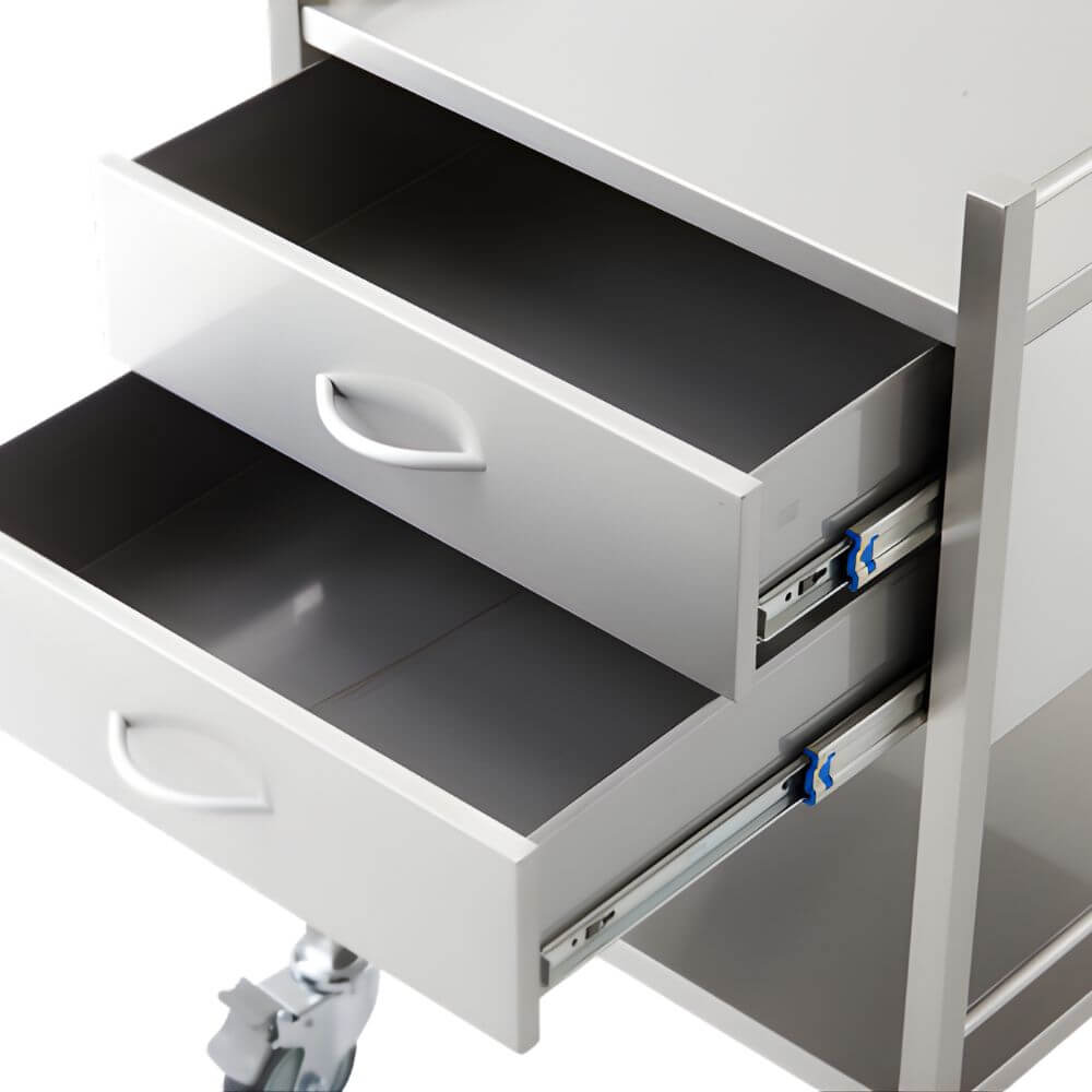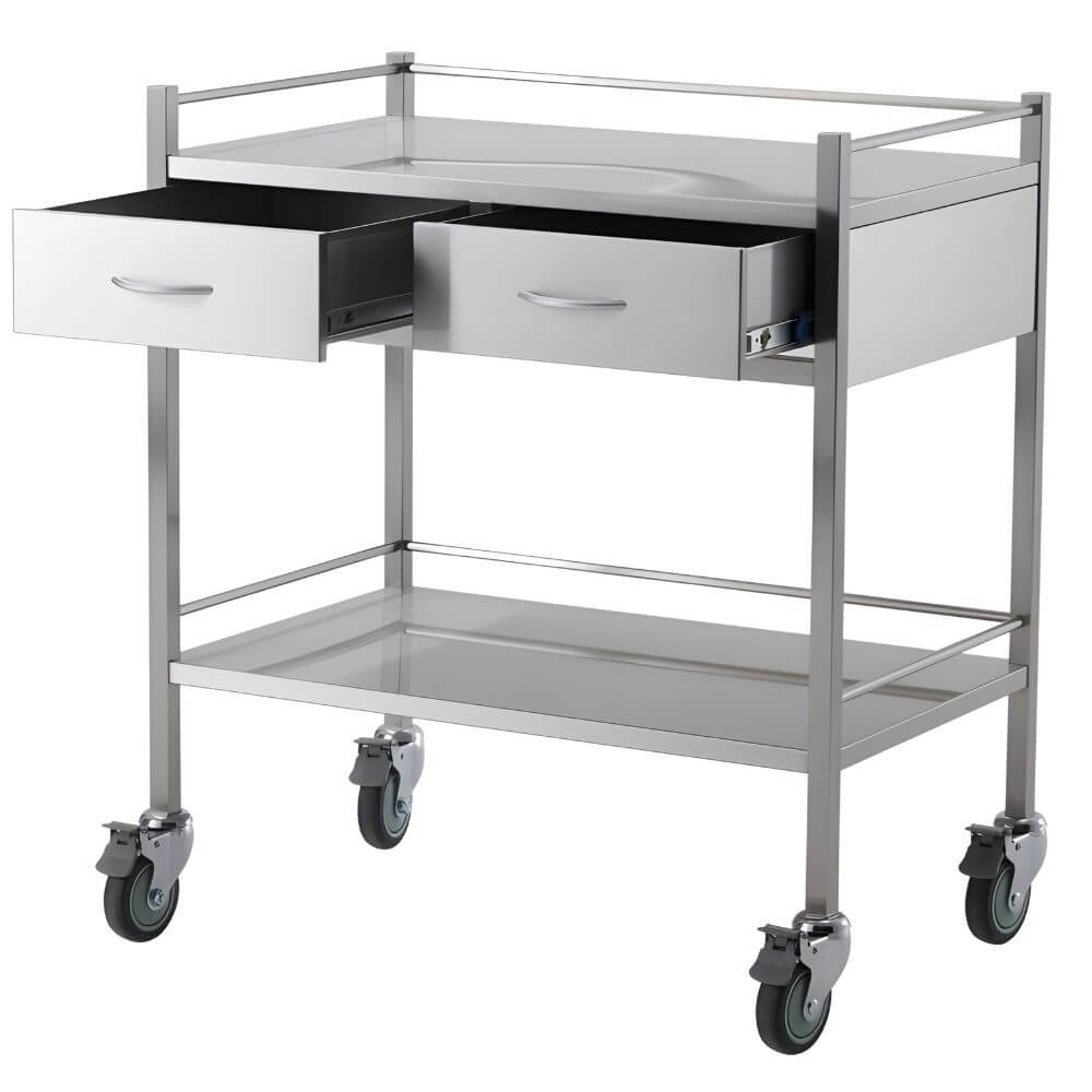 This sleek looking Dressing Trolley is manufactured from high grade 304 stainless steel throughout, ensuring it is a durable hospital cart that is rust-resistant and easy to clean. Designed for functionality in demanding commercial environments, this clinical trolley features two soft closing, magnetic drawers and german ball bearing runners for quiet, smooth operation. The addition of a bottom storage shelf provides ample space for larger medical supplies, making it a versatile medical supply trolley.
